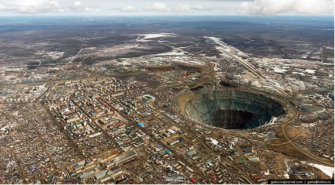 Mirny é uma cidade da Sibéria que foi construída devido à exploração mineira feita naquele buraco com um diâmetro de 1,2 km e uma profundidade de 525 metros.