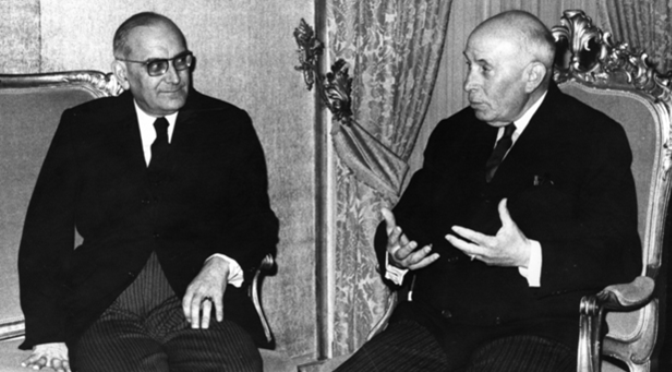 O ex-Presidente da República de Portugal, Américo Tomás e o presidente do Conselho de Ministros Marcelo Caetano no início da década de 1970.