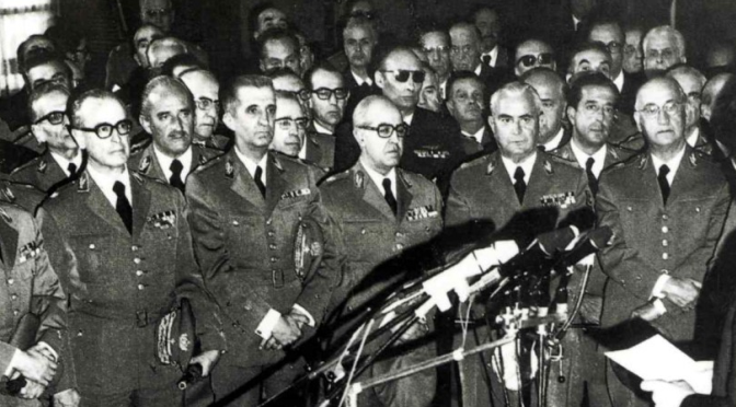 Foi esta degradação, cujos protagonistas, principais sintomas e cronologia procurarei identificar, que criou na instituição militar, e em especial no Exército, uma erosão acelerada e parcialmente consentida dos princípios de respeito pela hierarquia, mas também dos pressupostos de obediência do poder militar ao poder civil (na imagem, a inconsequente manifestação de lealdade de oficiais superiores a Marcelo Caetano a 14 de Março de 1974).